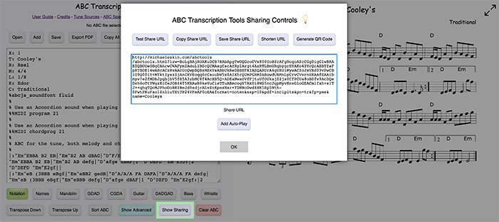 First generate a Share URL for the problematic tune or tune set by first clicking on the "Show Sharing" button below the ABC text area (outlined in the image below):