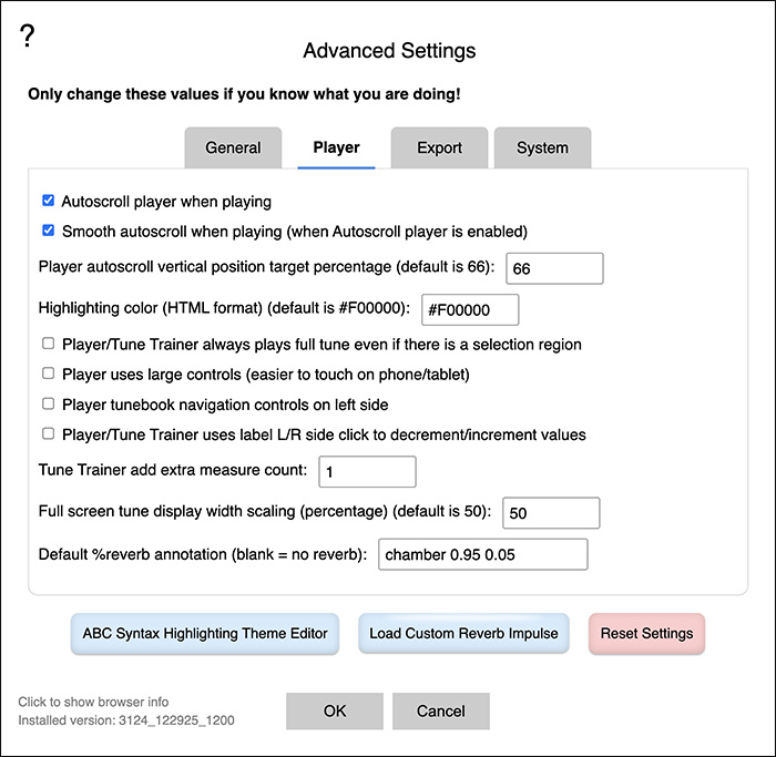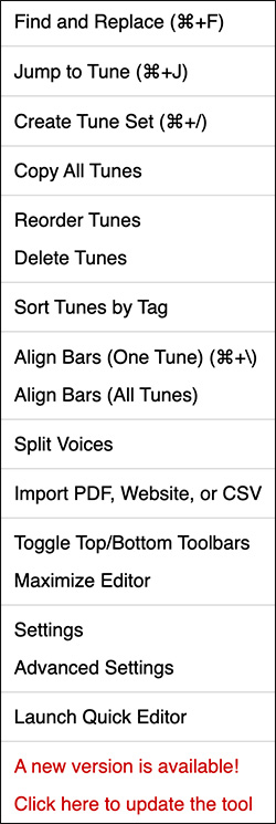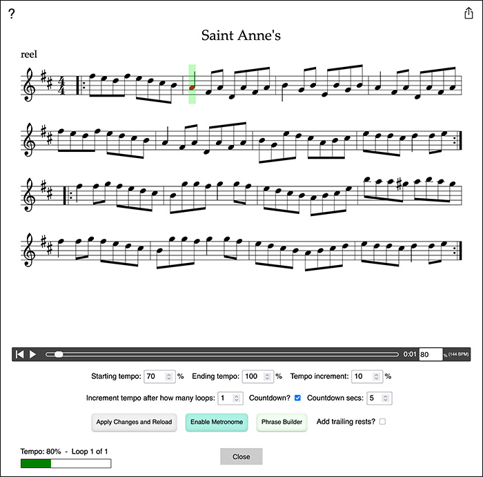 - Shift-click the Play button at the bottom-right of the window to open the current tune in the Tune Trainer to practice the tune with increasing tempos and optional phrase-by-phrase call-and-response training. (Standard editor only, not Quick Editor)