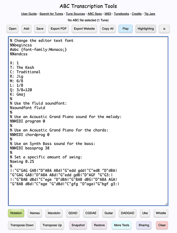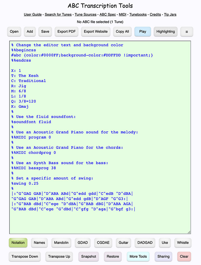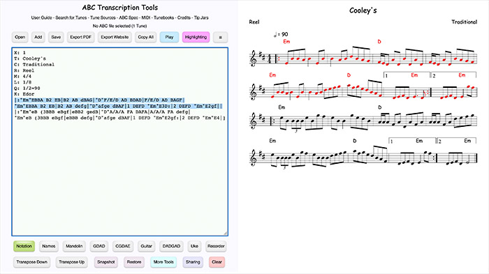 ABC Transcription Tools is a free, web-based, open-source platform for anyone who works with traditional music—players, teachers, arrangers, and tune collectors. It transforms ABC, MusicXML, BWW, and MIDI files into beautiful standard notation and tablature for many different instruments, right in your browser.
