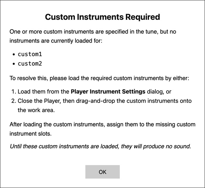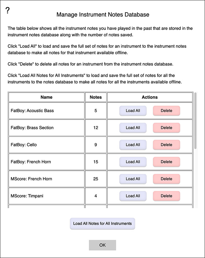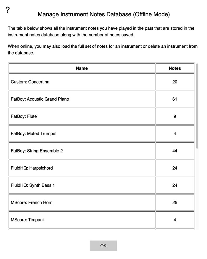 If an offline state is detected at tool start time, when playing tunes, all instruments are replaced with an acoustic piano sound, and the percussion sounds (MIDI program 128) are also available (for use in the metronome, primarily).