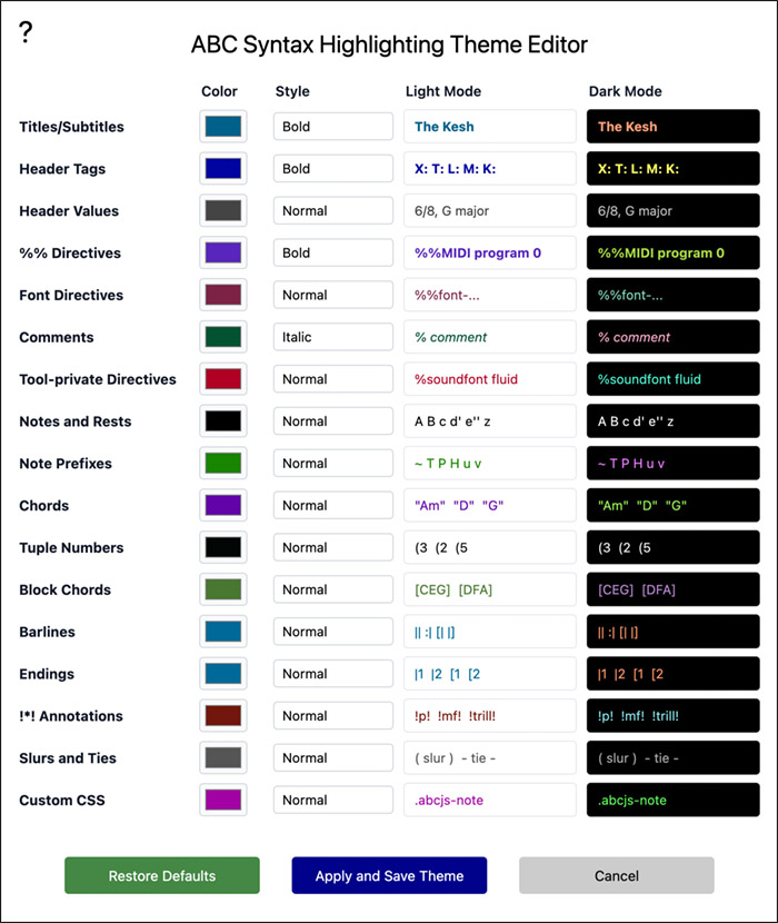 - Customize your look. Control spacing, fonts, and colors to match your style. Optional ABC syntax highlighting includes light and dark themes with customizable colors.