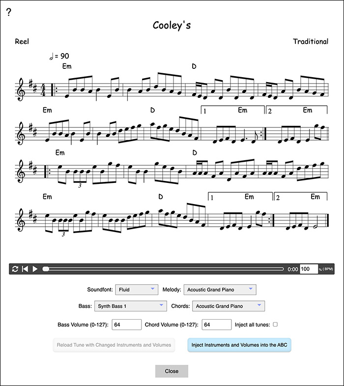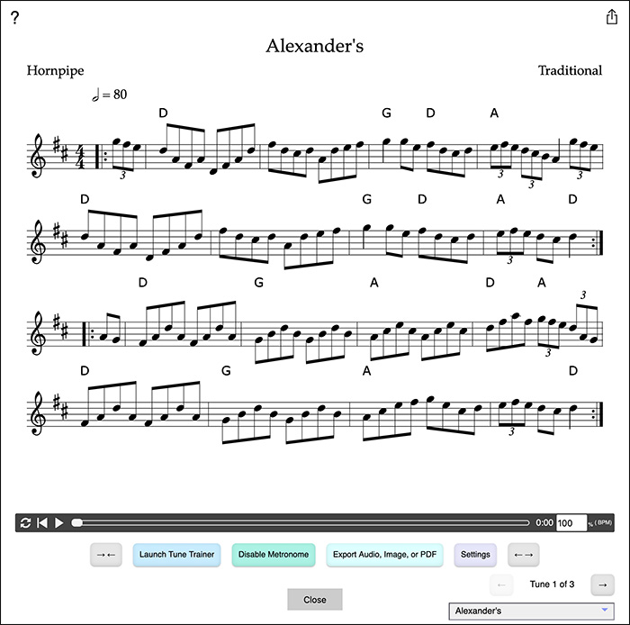 - Click the Play icon button at the bottom-right of the window to open the current tune in the Player.