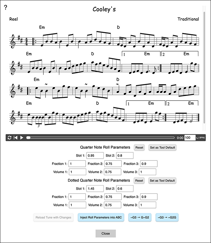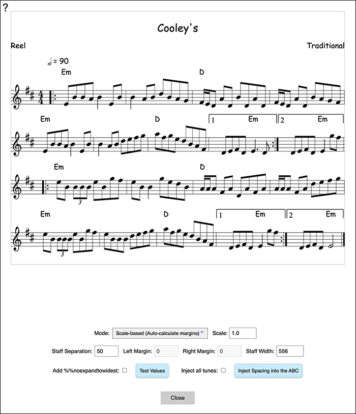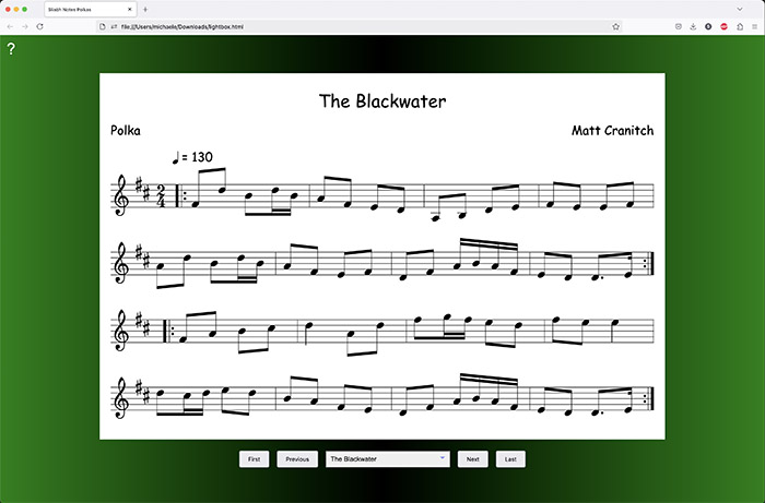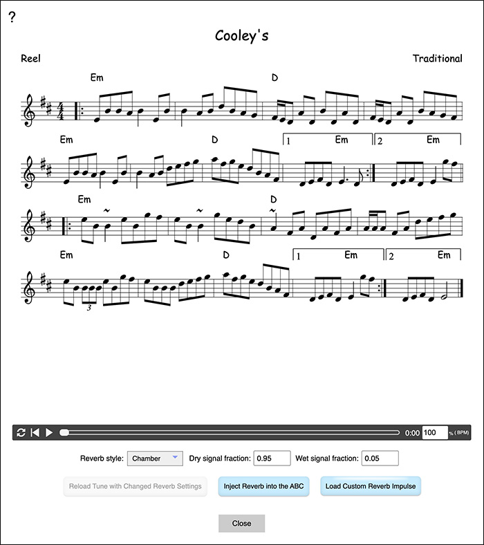 - If there is more than one tune in the ABC, you can click the "Jump to Tune" icon next to the Zoom arrows to immediately jump to any tune.